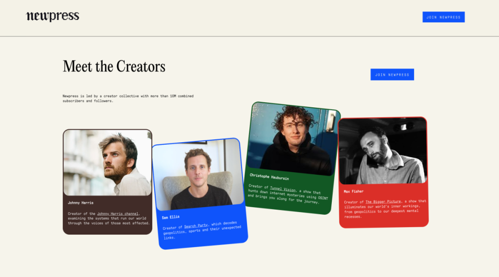 Perustajajäsenet ovat entisiä Vox-uutismedian tekijöitä: Sam Ellis (Search Party), Christophe Haubursin (Tunnel vision) ja uusimpana kiinnityksenä toimittaja ja kirjailija Max Fisher (The Bigger Picture). Ei varmaankaan ole sattumaa, että kaikki perustajajäsenet ovat Youtubessa erittäin menestyneitä miehiä. Reuters-instituutin uusimman News Creator -raportin mukaan suosituimmat uutisvaikuttajat ovat 24 maan kattavassa tutkimuksessa lähes aina miehiä.