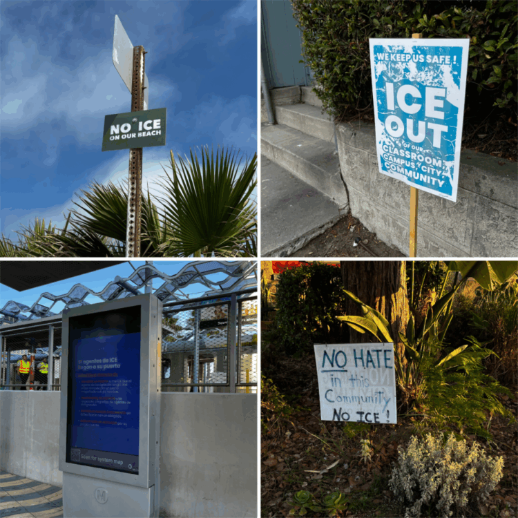 Kylttikollaasi: Eri puolilla Los Angelesia voi bongata maahanmuuttoviranomaisia vastustavia kylttejä. Metron ja metroasemien infokylteissä neuvotaan miten toimia, jos ICE:n agentti saapuu ovelle.
