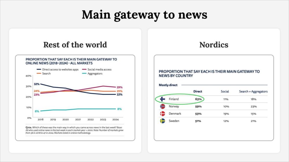 Samaan aikaan kun kansainvälinen keskiarvo suorasta liikenteestä putoaa, pohjoismainen yleisö nauttii uutisensa edelleen pääosin alkulähteeltä. (Taulukot: Reuters Digital News Report 2024)