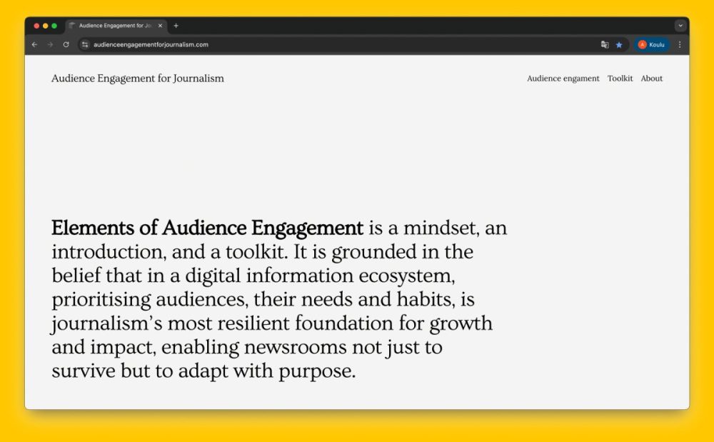 TL;DR Projektissa tutkin, miten yleisötyö (audience development) on kehittynyt, minne se on menossa ja miksi. Lisäksi sekä keräsin työkalupakin keinoista ja malleista, joita alansa parhaat käyttävät päivittäisessä työssä liiketoiminnalleen merkityksellisen yleisön sitouttamiseen. Kokosin työn verkkosivuksi, joka on luettavissa täällä: audienceengagementforjournalism.com.